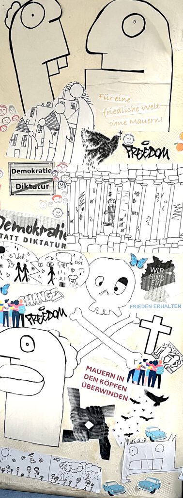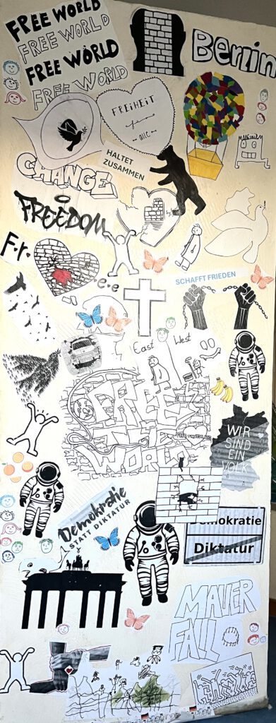 Unter Anleitung der Kunstlehrerin Frau Romano sammelten und gestalteten Schülerinnen der ehemaligen 6b und heutigen 6c Motive, die ihnen zum geteilten Deutschland, zu Ost und Westberlin, zum Mauerfall, Einigkeit und Frieden einfielen. Anschließend brachten sie diese in der sogenannten „Paste-Up-Technik“ an die Wände eines Mauerblocks.