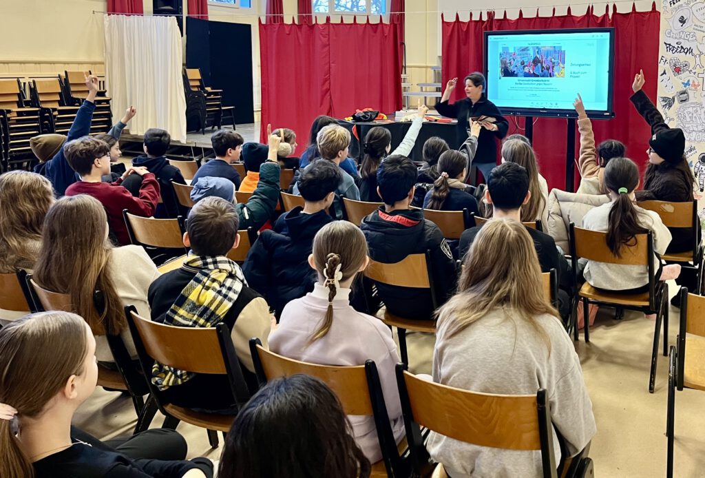 Im Januar 2026 kamen 6. Klässler, unter anderem die Kinder, die an der Neugestaltung beteiligt gewesen sind, in der Aula zusammen. Frau Syll und Frau Romano erzählten von bisherigen Schul-Projekten zu Mauer und Einheit. Auch der Kurzfilm „Nicht wegschauen“ wurde von den Schülern mit Interesse angesehen und besprochen. Die Motive des neugestalteten Mauersteins gaben Anlass für weiteren Austausch. Mit einem Quiz und einem Mauerstein-Kuchen wurde sich darüber hinaus spielerisch mit dem bedeutenden Kapitel deutscher Geschichte auseinandergesetzt.