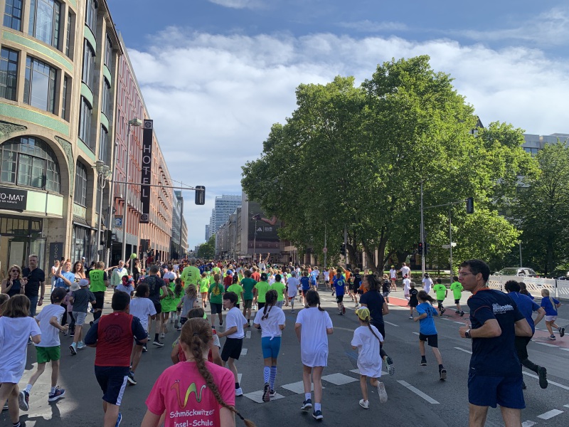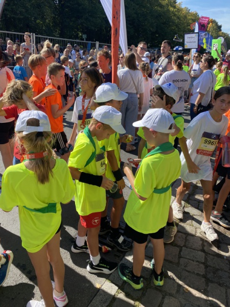 An der Strecke klatschten unzählige Zuschauer Beifall. Außerdem unterstützten auch mehrere Trommelbands, Cheerleader und Musikbands die Läufer*innen. Viele Kinder konnten sogar auf den letzten Metern noch einen Schlusssprint einlegen. Nach dem Ziel konnten sich alle Teilnehmer*innen stolz eine Medaille und eine Urkunde abholen, sich mit Wasser, Äpfel und Bananen versorgen und sich dann im dichten Gedränge zum Treffpunkt der Grunwald-Grundschule begeben.