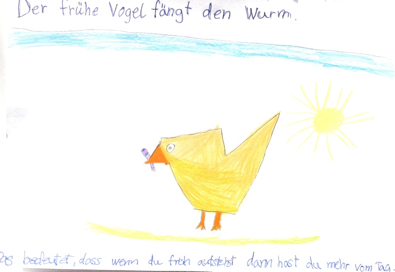 Was sind eigentlich Sprichwörter und welche kennen wir? Was möchte jemand mit „Ich glaub‘, mein Schwein pfeifft!“ eigentlich sagen? In bunten Bildern werden die Lieblingssprichwörter der Kinder gemalt und erklärt. Kennt ihr das Spiel „Teekesselchen?“ Wir sind inzwischen Profis geworden. Wie viele verschiedene Bedeutungen zum Wort „Tafel“ fallen dir ein?
